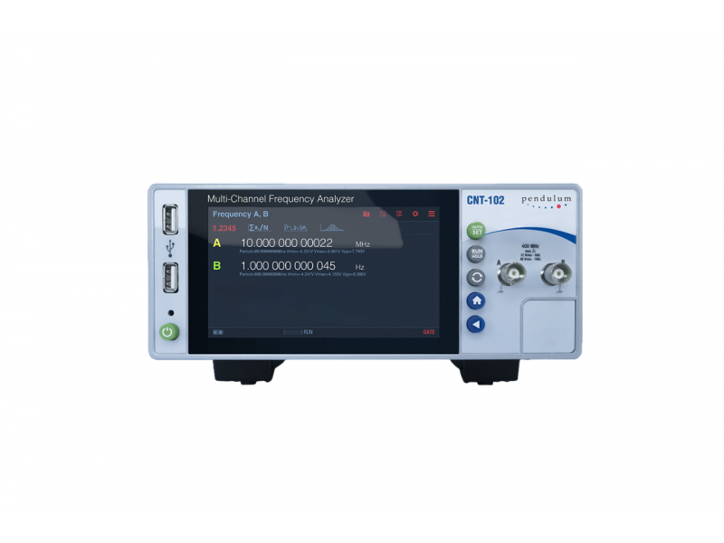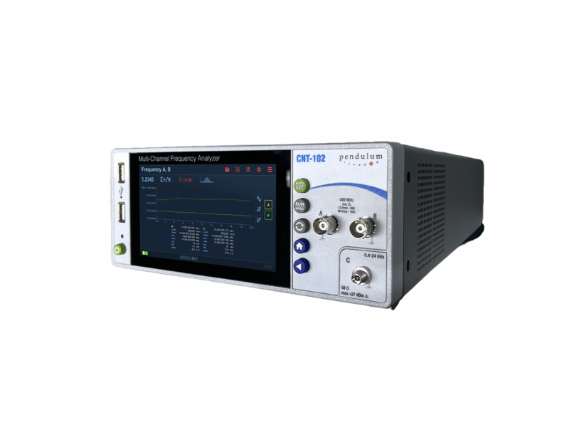 O Pendulum CNT-102 é um novo modelo acessível da família CNT-100 para análise de frequência multicanal e intervalo de tempo de super desempenho em uma unidade de bancada. Você pode rastrear frequência, fase ou tempo paralelos simultaneamente em 2 canais de entrada na grande tela gráfica. Esses instrumentos apresentam medições sem lacunas e têm resolução de 14 ps, resolução de frequência de até 13 dígitos/s e velocidade de medição de 1 milhão de resultados/s. O CNT-102 supera qualquer temporizador/contador/analisador concorrente no mercado. Para um desempenho ainda maior, verifique nosso CNT-104S, um analisador de frequência multicanal de 4 entradas com resolução de 7ps e velocidade de até 20MSa/s.