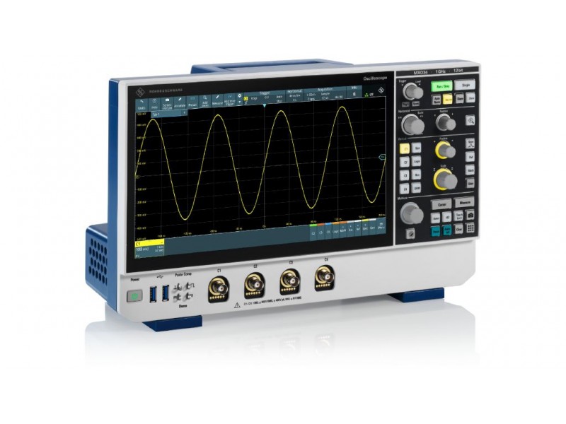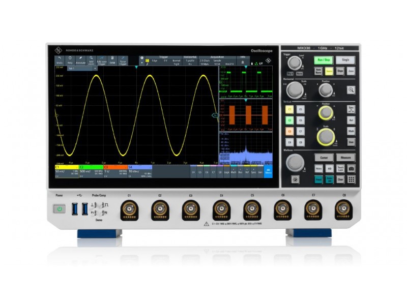Apesar de seu formato reduzido — apenas 5U em rack —, o MXO 3 não economiza em funcionalidade. Oferece até 8 canais analógicos, interface eficiente com painel touchscreen Full HD de 11,6″ e recursos como disparo de zona (zone trigger), FFT rápida de até 50.000 por segundo e interface intuitiva com R&S SmartGrid. A sensibilidade de trigger é impressionante, chegando a 0,0001 divisões verticais e rearmamento em menos de 21 ns.